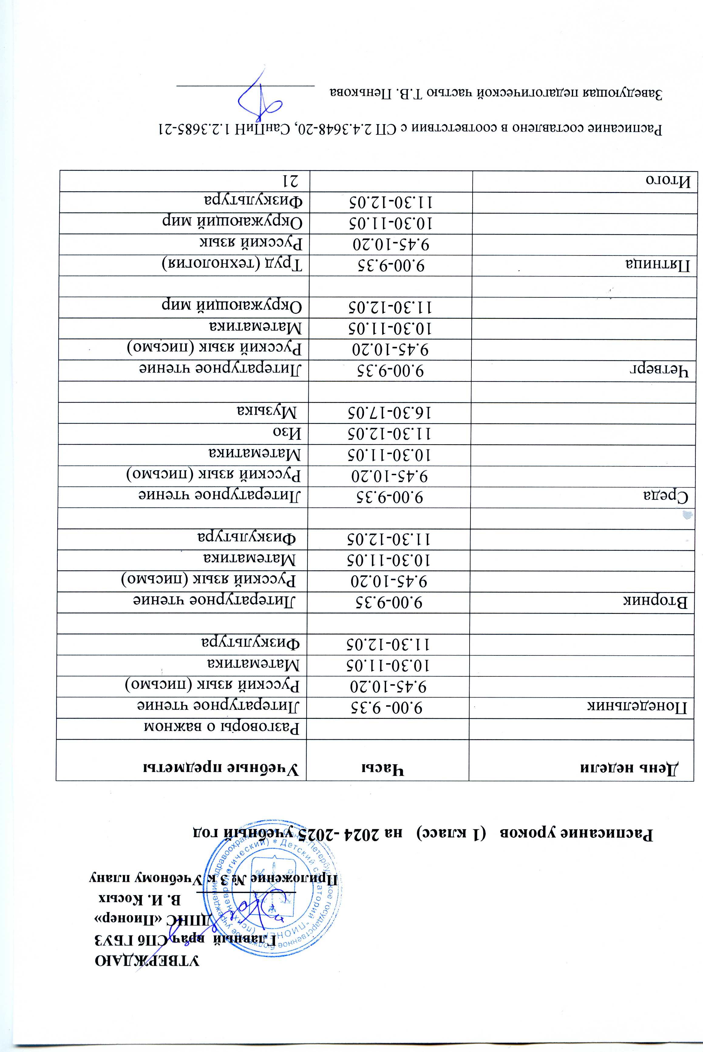 Расписание уроков 1 класса на сентябрь - май 2024 - 2025 учебный год