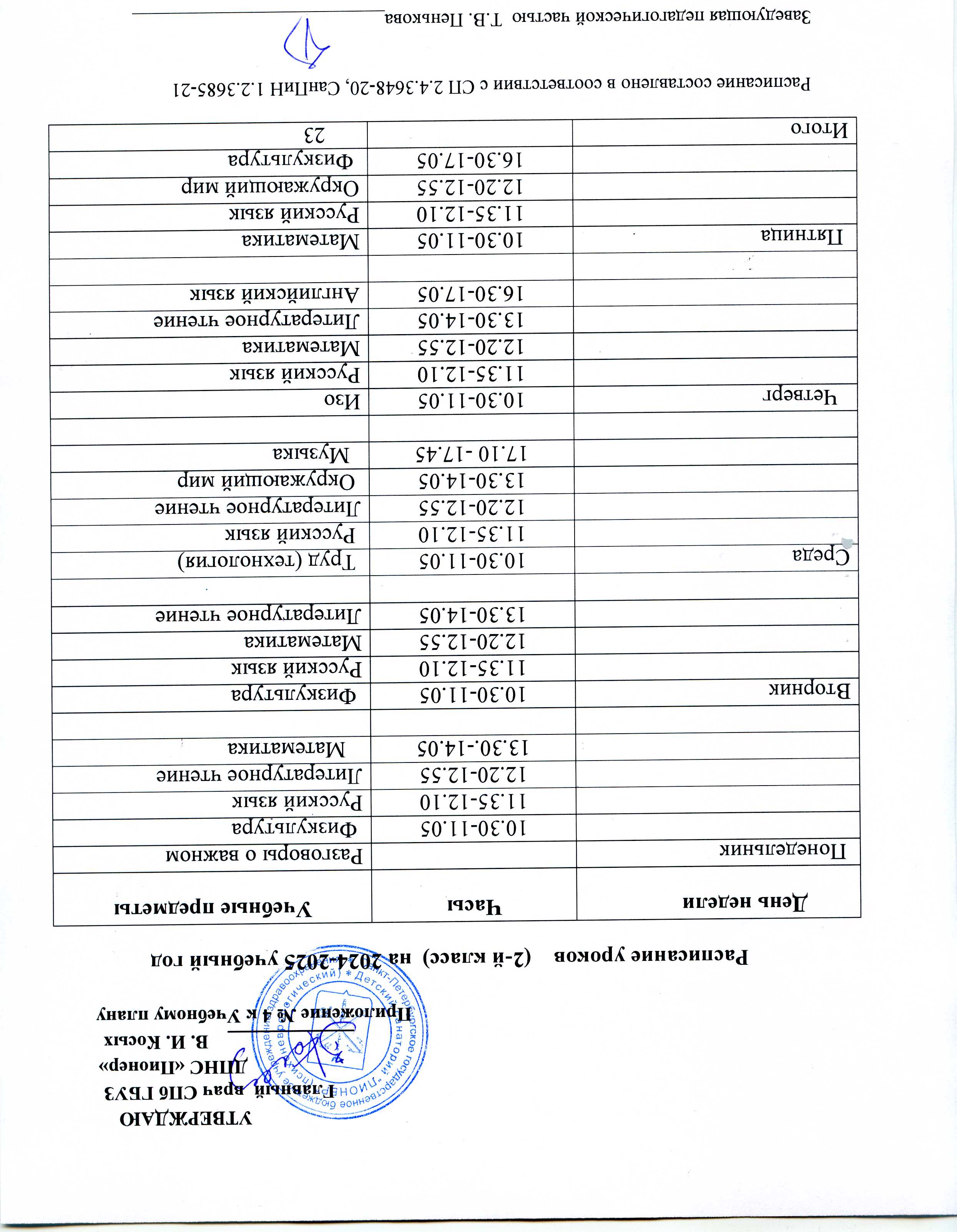 Расписание уроков 2 класса на сентябрь - май 2024 - 2025 учебный год